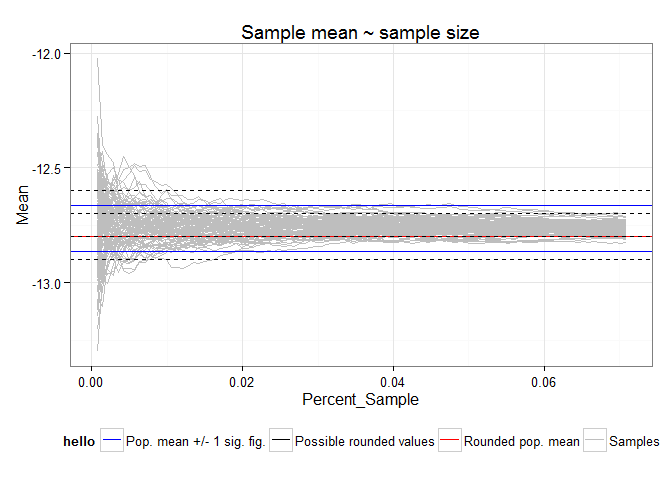 Example of population mean vs. sample mean for a typical map of SNAP’s Alaska-Canada 2-km downscaled data. The sample mean converges in distribution to the population mean quite quickly.